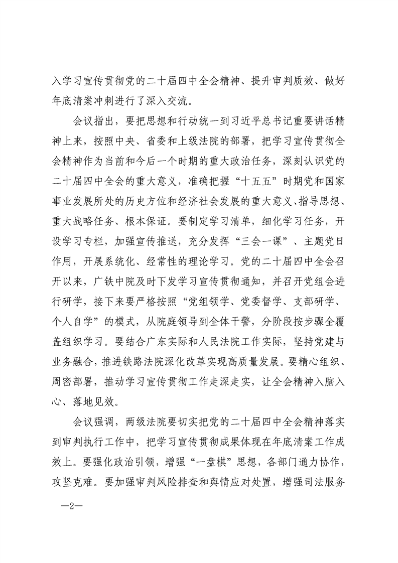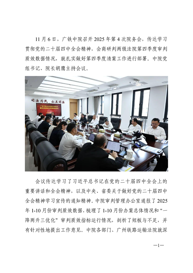 广铁中院传达学习贯彻党的二十届四中全会精神 部署2025年第四季度清案及质效提升工作